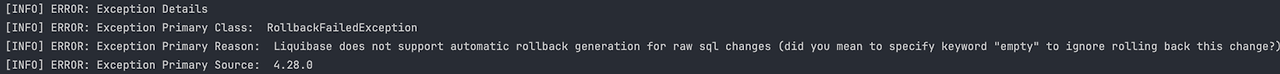 - Liquibase가 Raw SQL 변경 사항에 대해 자동 롤백 스크립트를 생성 하지 않는다.