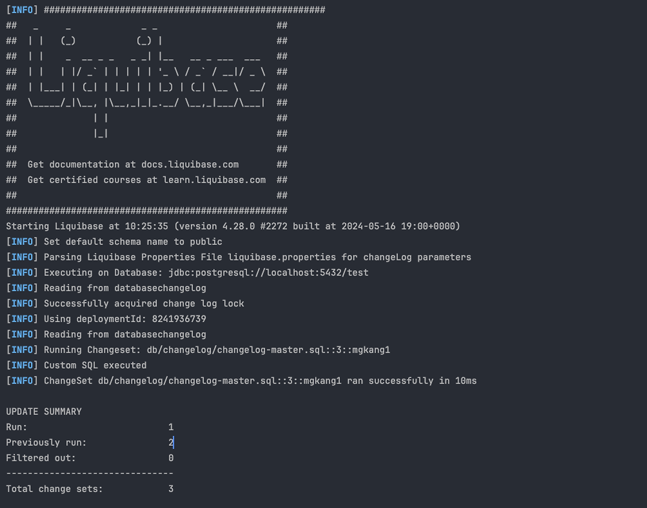[INFO] ChangeSet db/changelog/changelog-master.xml::8::mgkang1 ran successfully in 2ms